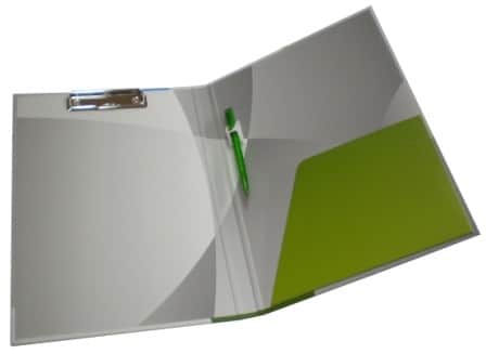 פולדר מקרטון קשיח מודפס פרוצס חיצוני ופנימי, מנגנון תיוק עליון, כיס צדדי, ועט
