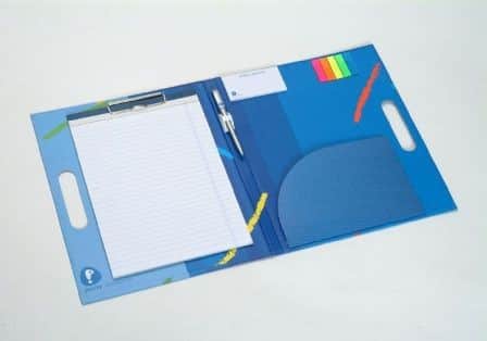 פולדר מקרטון קשיח מודפס פרוצס חיצוני ופנימי עם חיתוך בשטנץ של ידית נשאה, מנגנון תיוק עליון + בלוק דפים כיס צדדי, בלוק דבקיות, סט דיגלונים, ועט